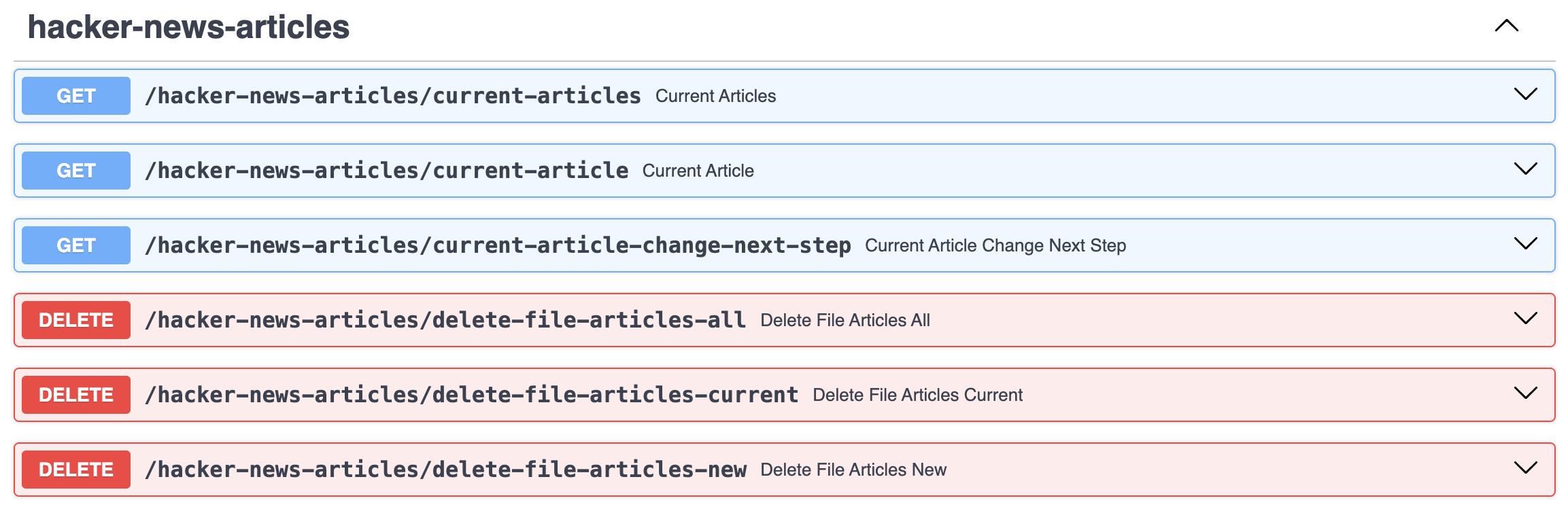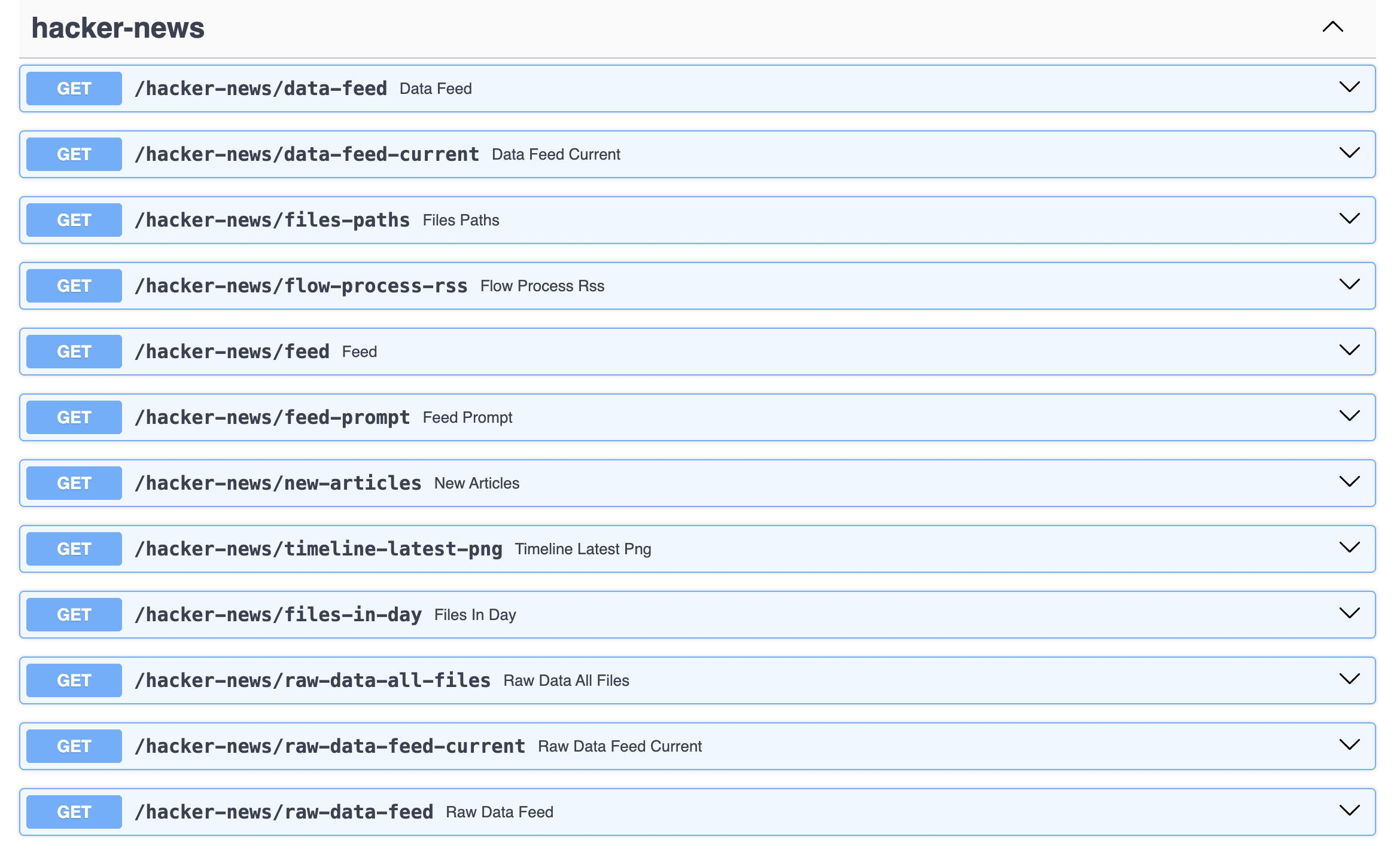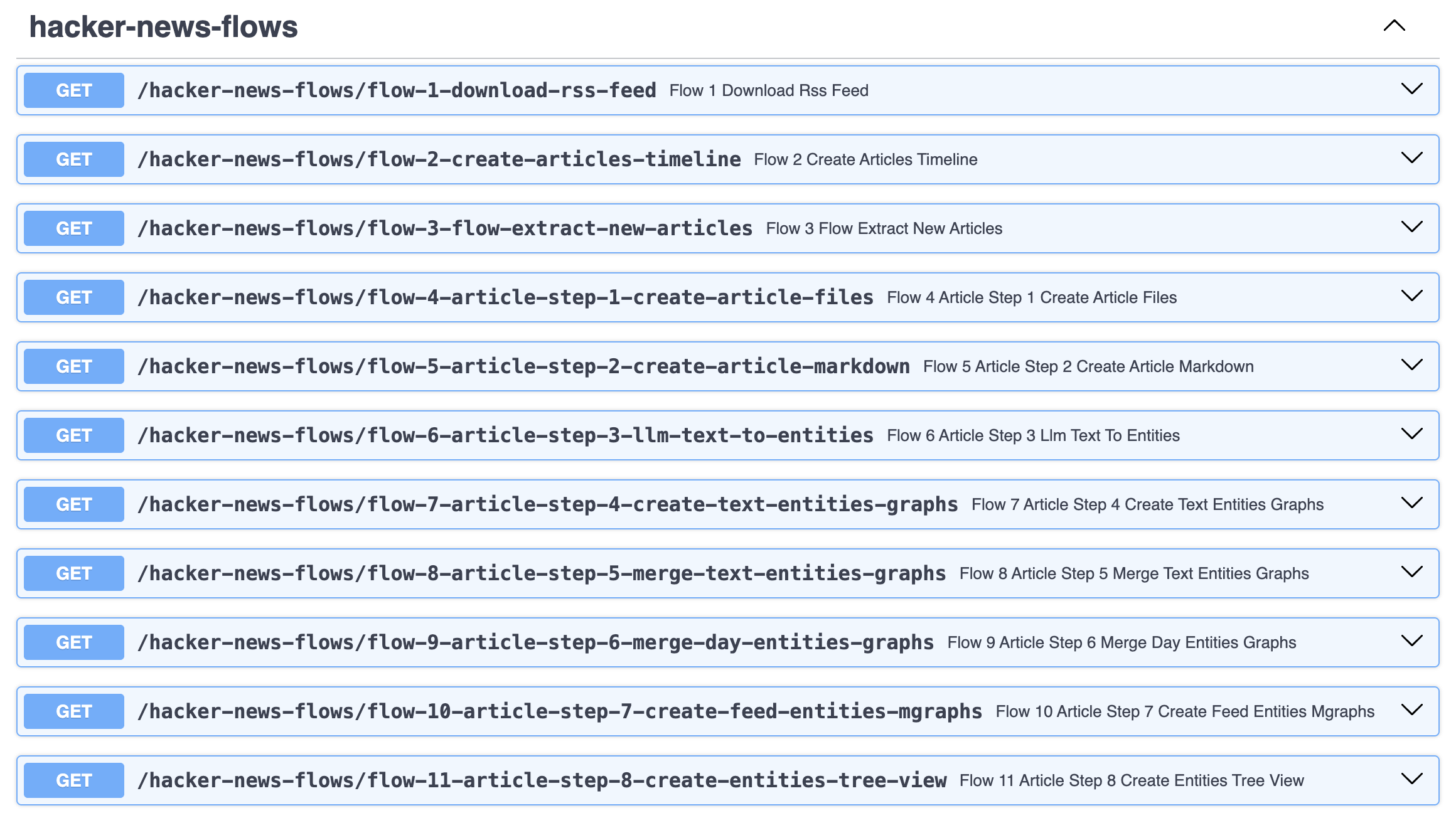 We start the full workflow by invoking the endpoint hacker-news-flows/flow-1-download-rss-feed which downloads the RSS feed and converts it into an JSON file