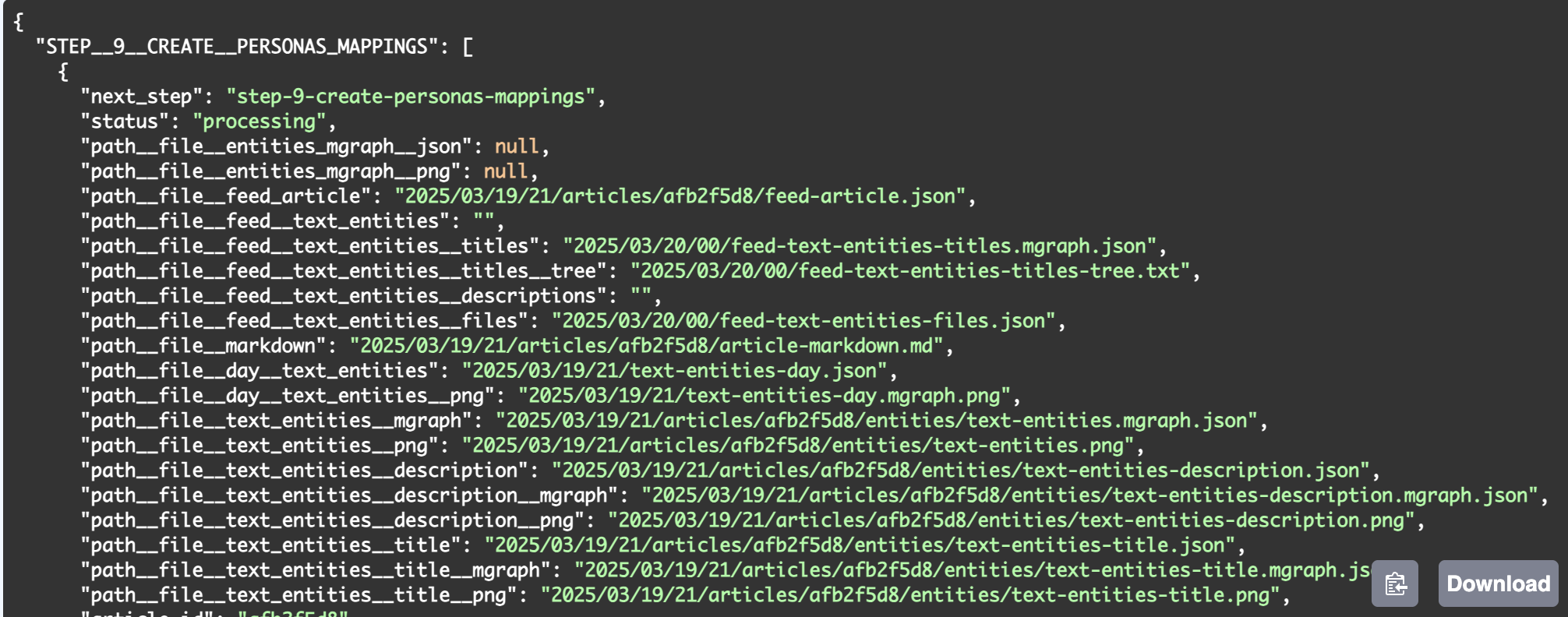 This data is then used to update the latest/articles-current.json files which now contains the entries for the articles ids listed in the added_values in the Step_1__Save__Article step (and empty data in those path_* variables