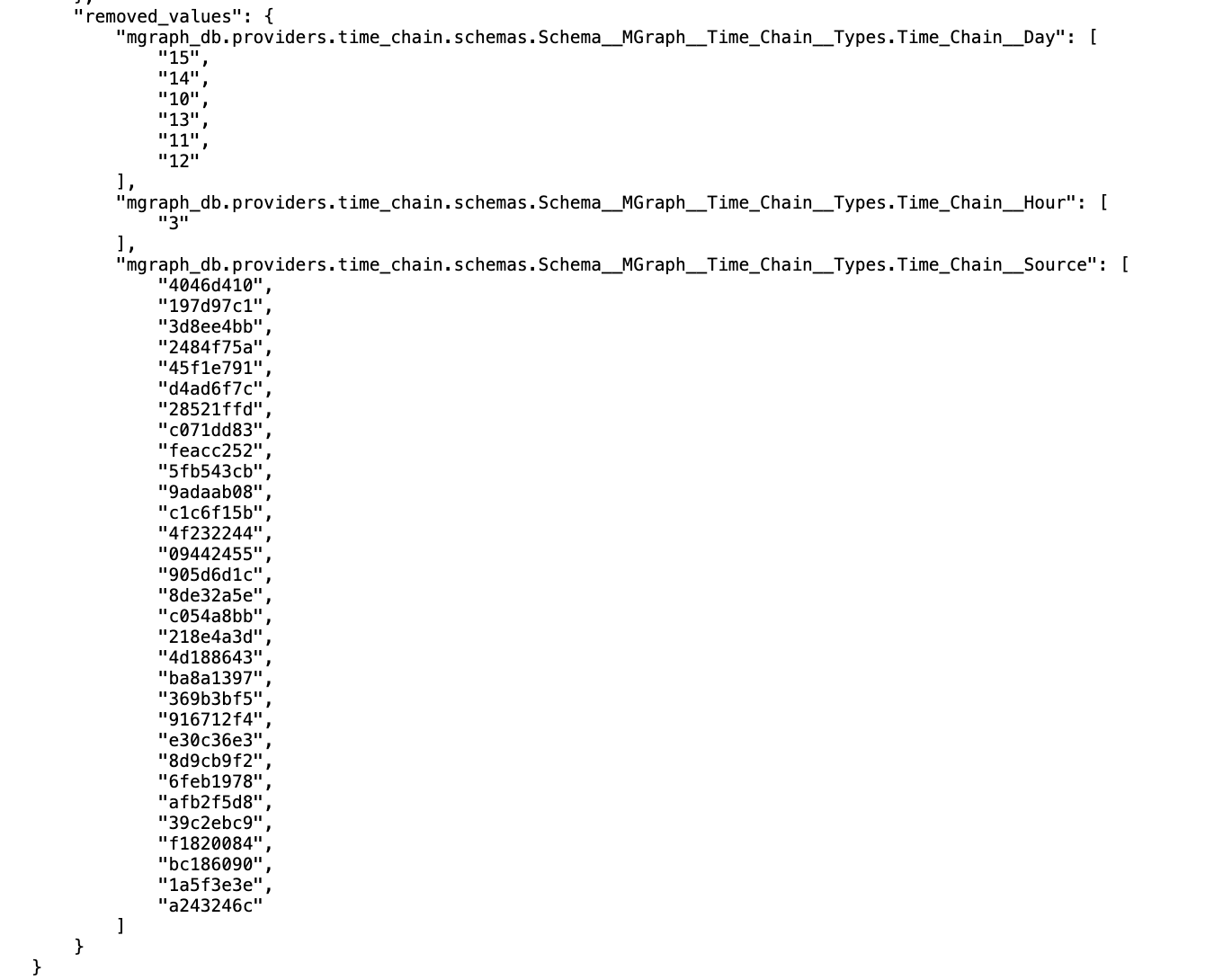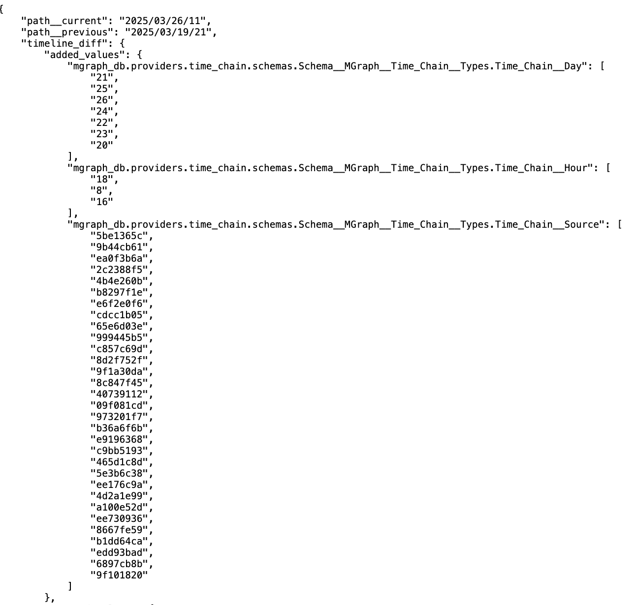 This is a MGraph Timeline-Diff object, which contains two main sections: added_values and removed_values, which in practice are the nodes added and removed between those two graphs.