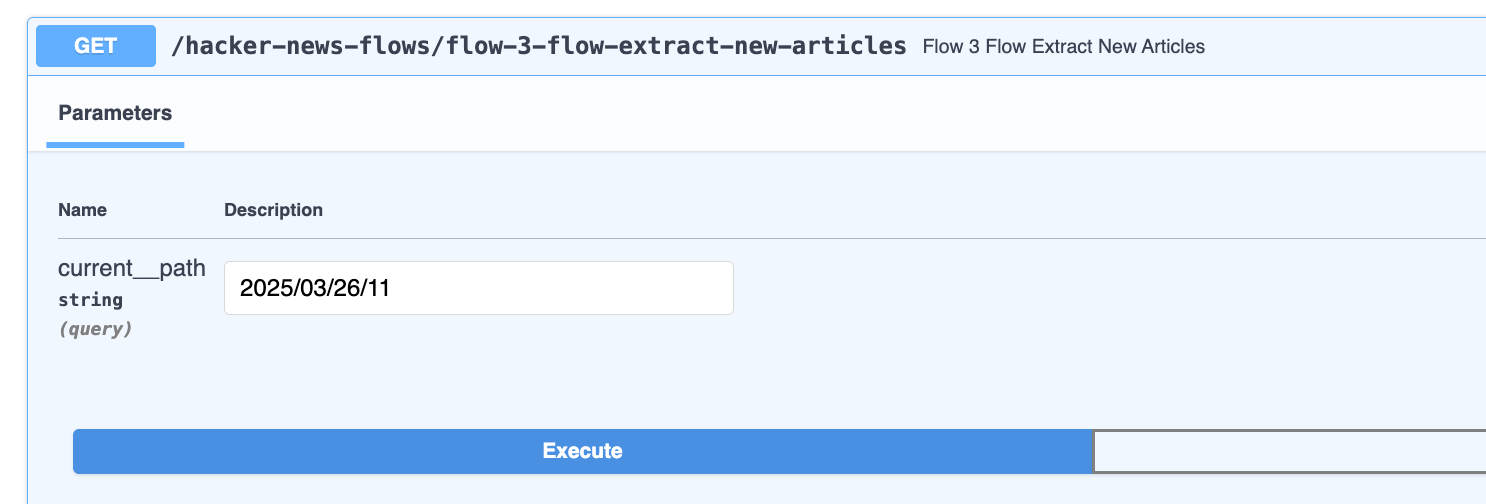 Now that we have an updated timeline, the next step is to call the hacker-news-flows/flow-3-flow-extract-new-articles endpoint with the date to use as current_path (i.e. the new baseline time for creating the MGraph Diff)
